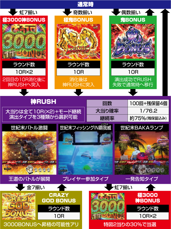 初当りの1%は虹7図柄揃いから「極3000神BONUS」に当選し、10Rを2回消化後に神RUSHへ突入。奇数図柄揃いから当選する「極鬼BONUS」は神RUSH突入が確定。偶数図柄揃いから当選する「鬼BONUS」はラウンド演出に成功すれば神RUSHへ突入する。