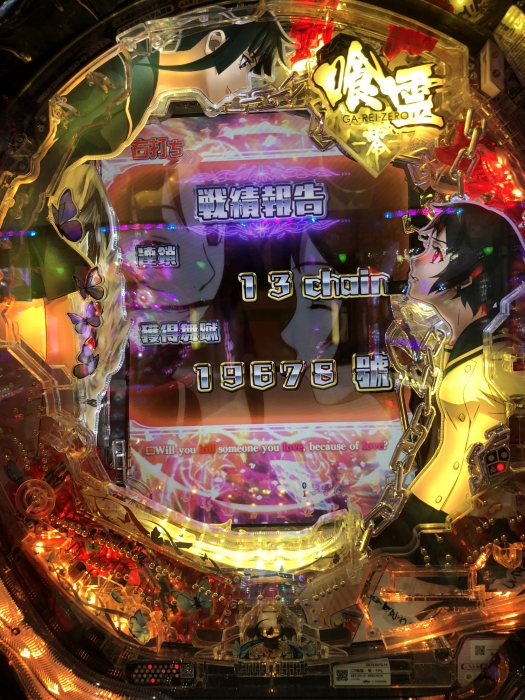 実戦内容としては、保留ボタン変化→タイマーから弱SP(ハズレ)・パラダイスロスト図柄→保留変化(赤)→黄泉SP「悲劇 裏」(ハズレ)と当たりなしでしたが、隣の台が朝イチからの連チャンが伸びて5万発出てたのでST連すれば夢は有りそうかな・・・って感じでした。