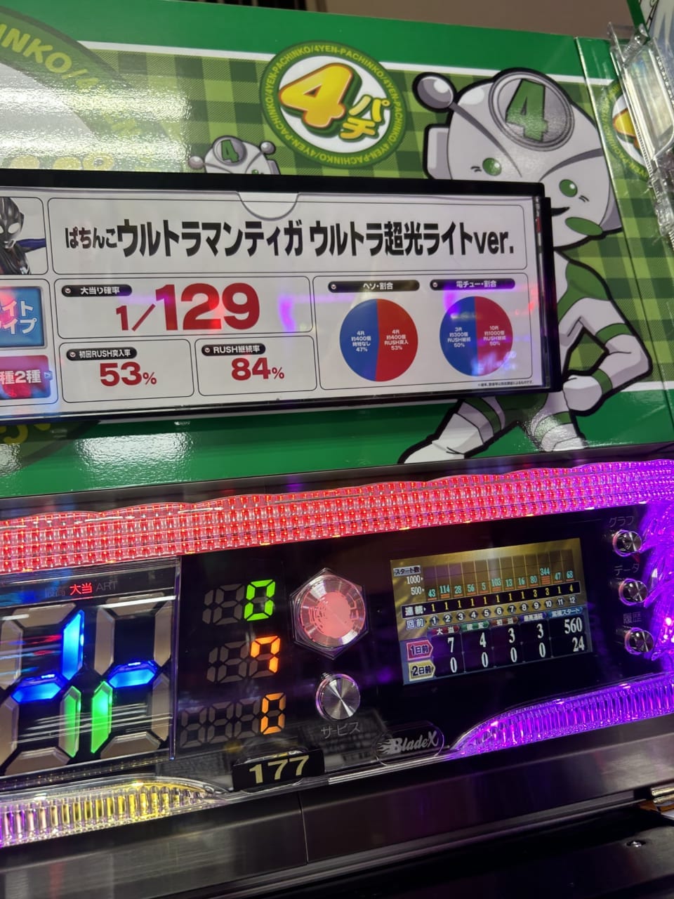ウルトラ超光RUSHは転落抽選型の時短モードで、継続率は約84%。転落確率1/129.9を引く前に1/30.2の大当りを引けばRUSH継続。RUSH中の大当りは3 or 10Rで、半数が10Rかつ光臨演出が発生すれば10R×2以上が確定する。