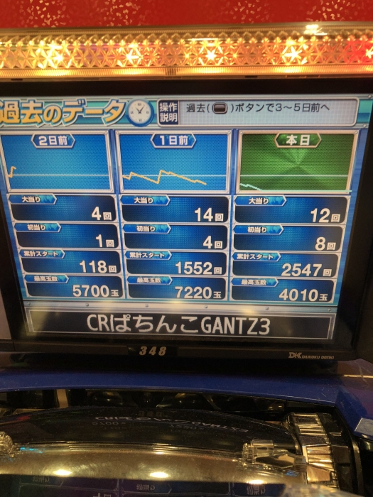 移動した台が2回転で小当たりになり潜伏状態で203回転で大当たり12連チャンでガンツの嫌な感じをふきとばしたが^^