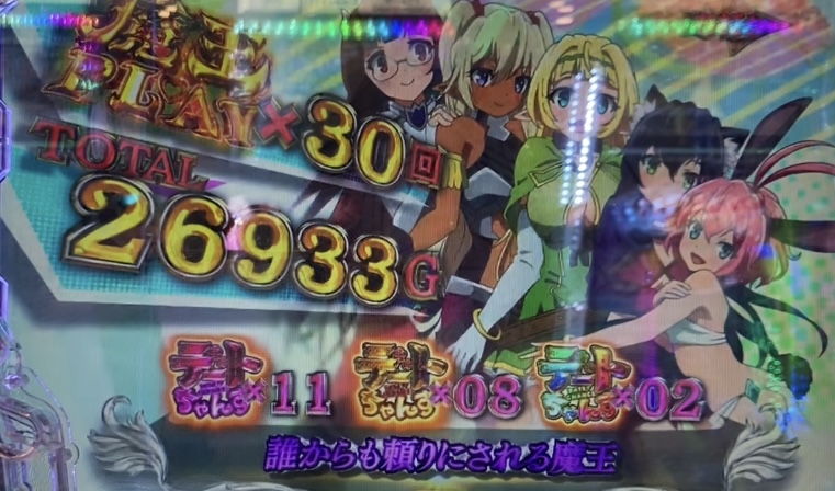 魔王PLAYモードは基本的に1変動で当り、ラウンド中の演出でVストックを目指すゲーム性。Vストックがなくなるまで大当りが連続し、初回突入時は2個のVストックを保持。最大で4個までストックできる可能性があり、4個ストック時の期待値は約11000個超となっている。