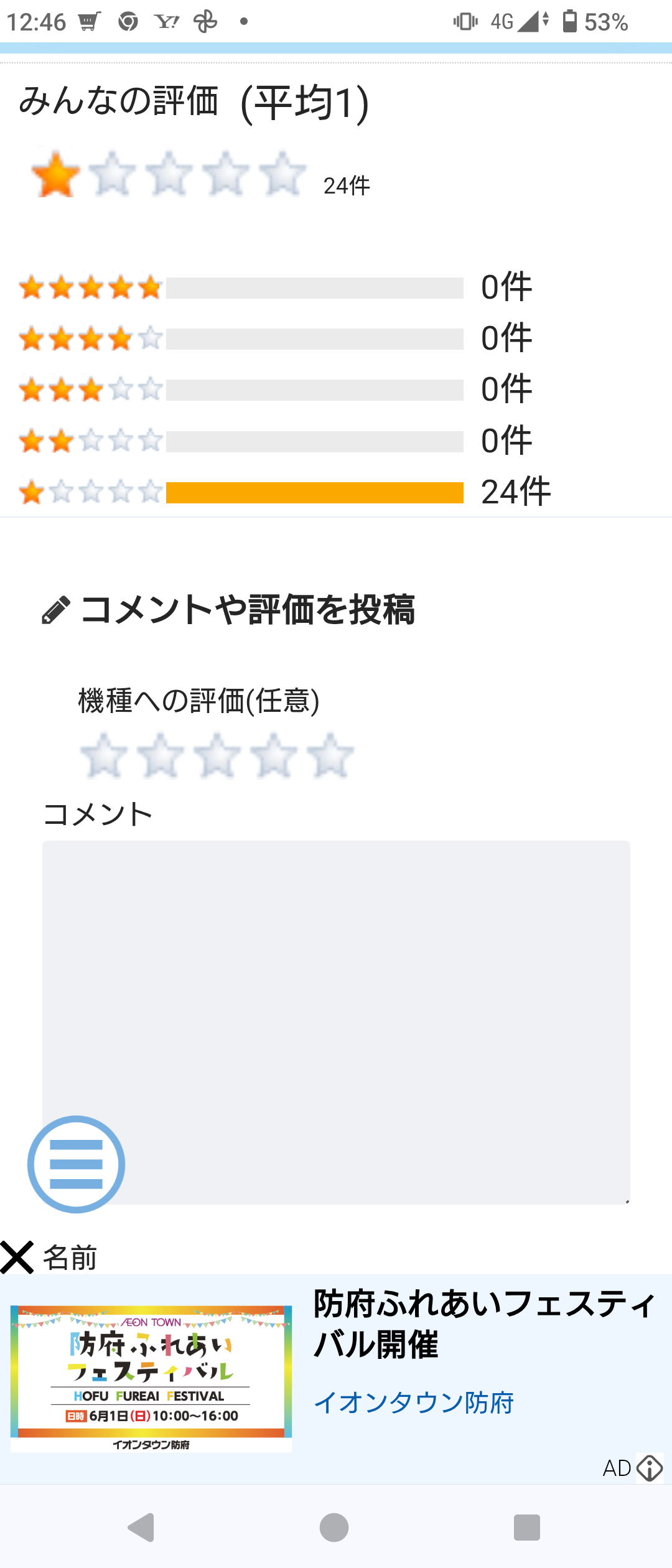 複数のコメントと評価が入って、平均評価1のパチンコとか初めて見たよ。