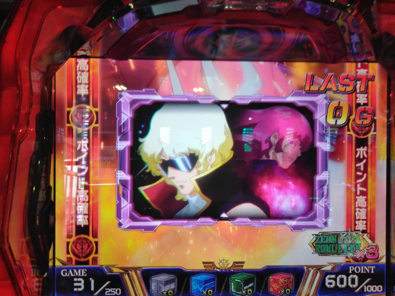 後、CZスルー後からレッドゾーン消化→ジオンルーレットで百式バトル(約32G)が選択されてAT確定CZが選ばれた事もあります。