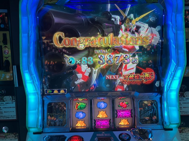 可能性の獣で、初めて930Gという大台を頂戴してホクホクしていたら、すぐにUB/ミネバチャンス/FB/覚醒BATTLEに繋がり、エンディング発動。1,500枚程度吸い込んでいたのでmax.4,000枚弱まで行けるはずと思いつつ、その時の獲得枚数が1,200枚ほど。不安になったが、本当に2,700枚をゆっくり引き出す作業が続いた。