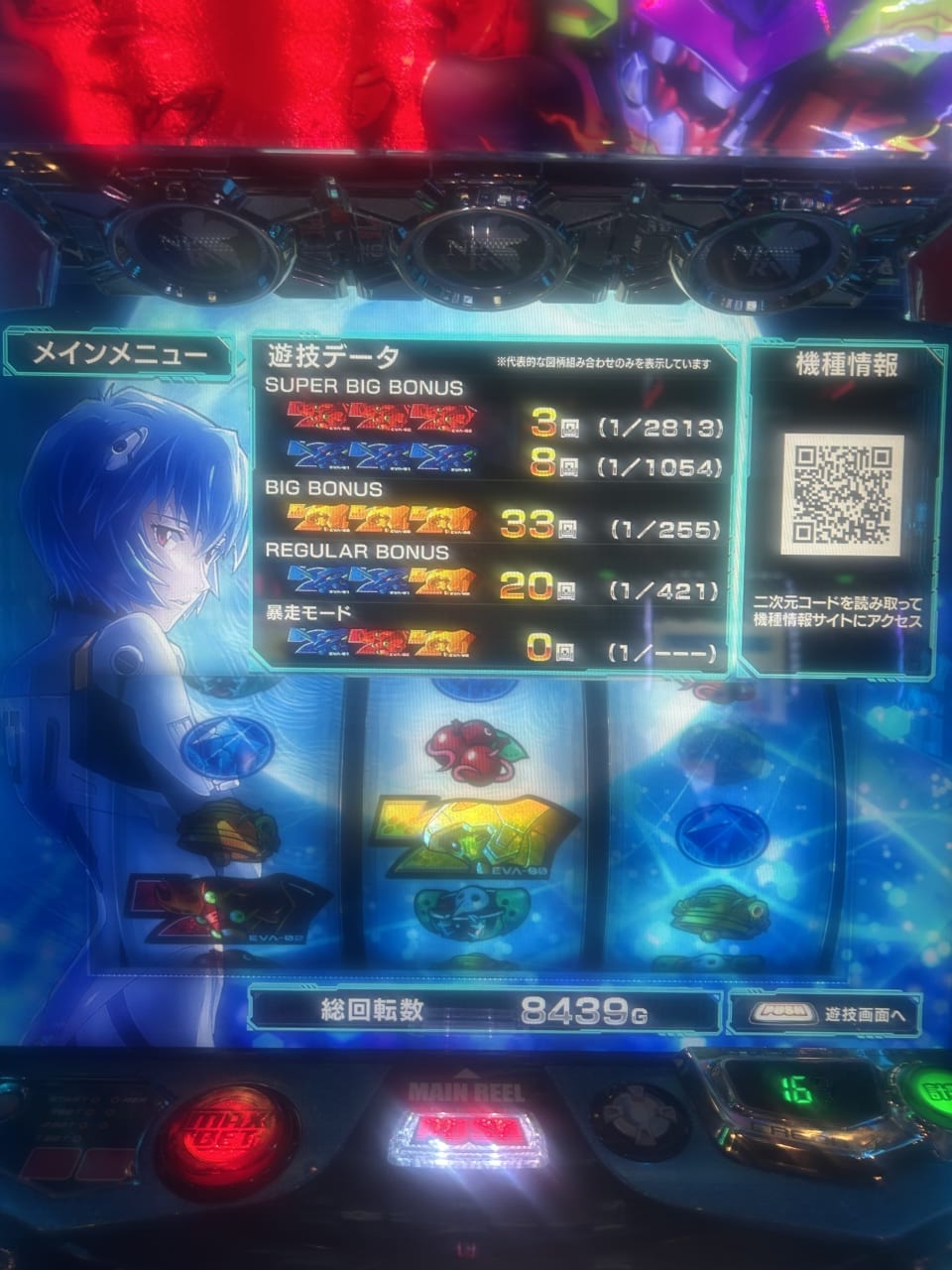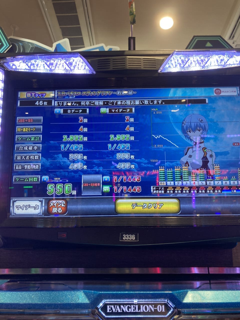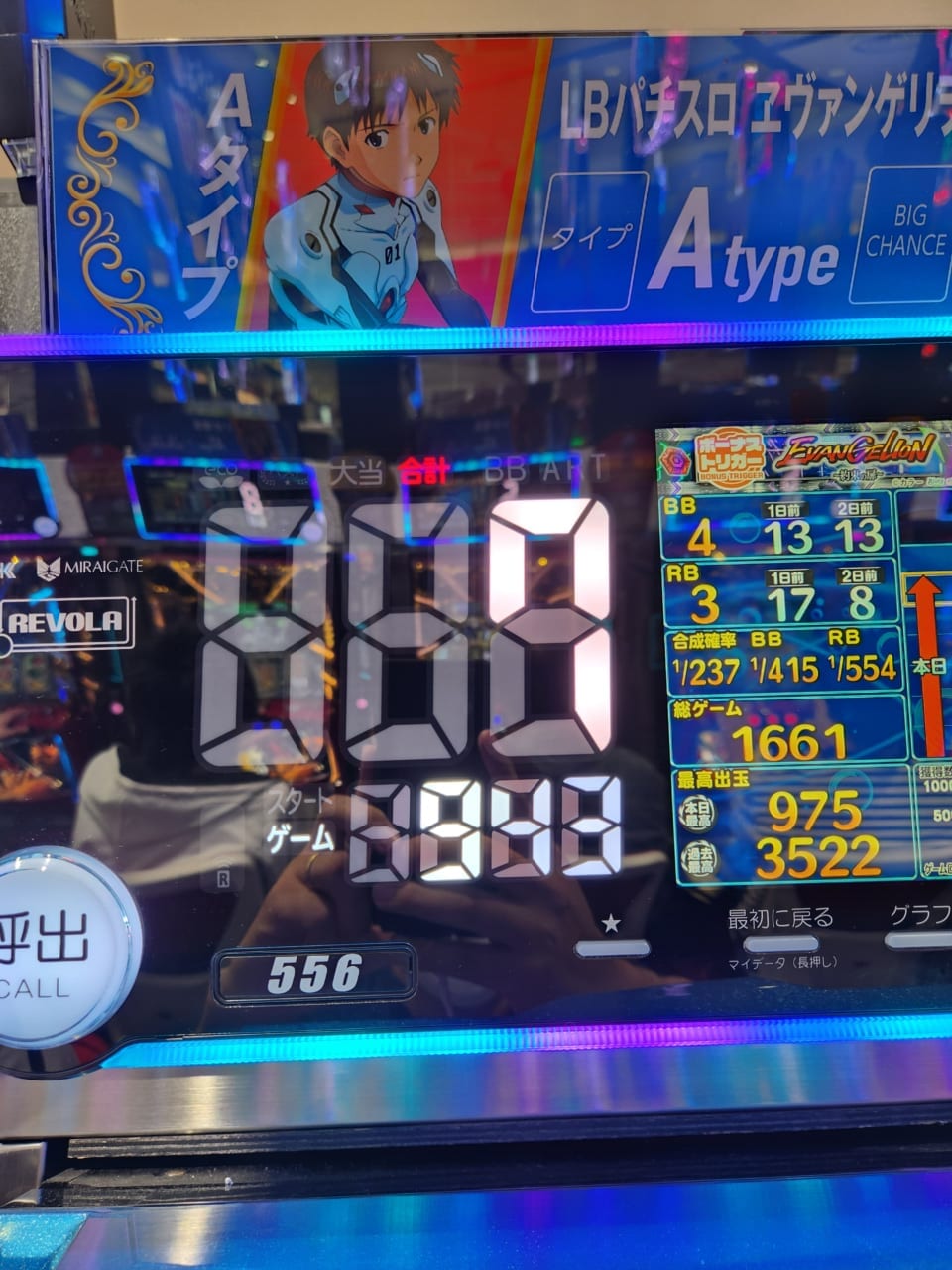 朝一モンハンでヤラれたツレが打つ台なくて昼過ぎくらいに合算300超えのエヴァに座ったら(画像矢印SBB)終了画面でまさかのカヲル君、信じて打ち続けて合算が150に到達したのは15時40分、収束に約7時間、閉店までブン回して4600枚獲得、カヲル君が出て無かったら余程子役確率が飛び抜けてないと追えないだろっという結果に…