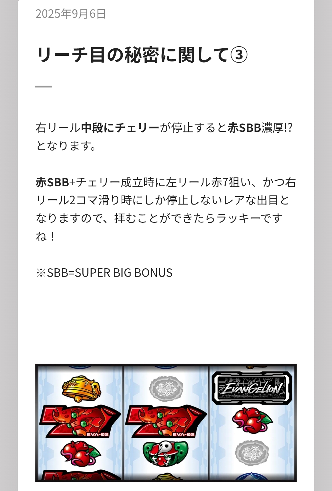 一応リーチ目役やスイカからの赤7はありえるけど逆押しでチェリー止まったら赤7否定だし、SBB振り分けが他ボーナスより低いのに赤と青の2種類あって赤である可能性も低くなってるわけだし。