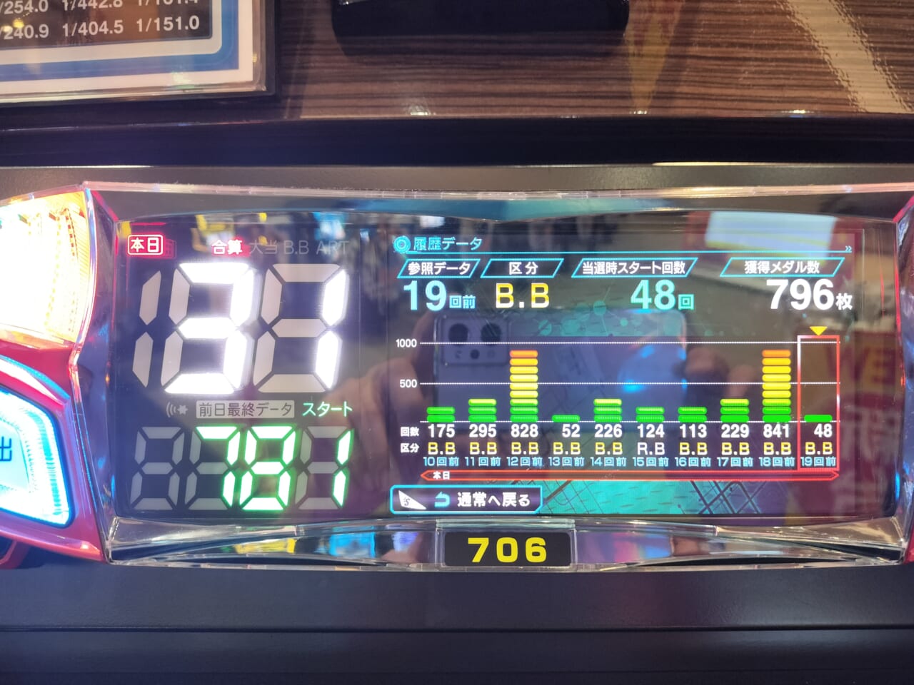ノーボーナス目は赤七下段リプリプの中段揃い1手でわかる。青7ではボーナス有り黄色だったかな?