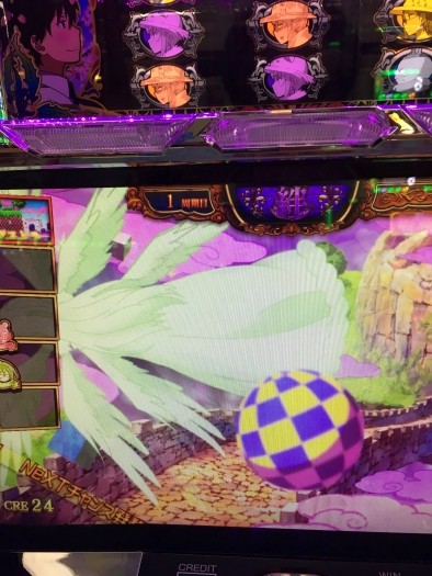 エクストラ周期到達時のボーナス準備中画面です。少し見づらいですが周りの模様と準備中の文字が虹色でした。