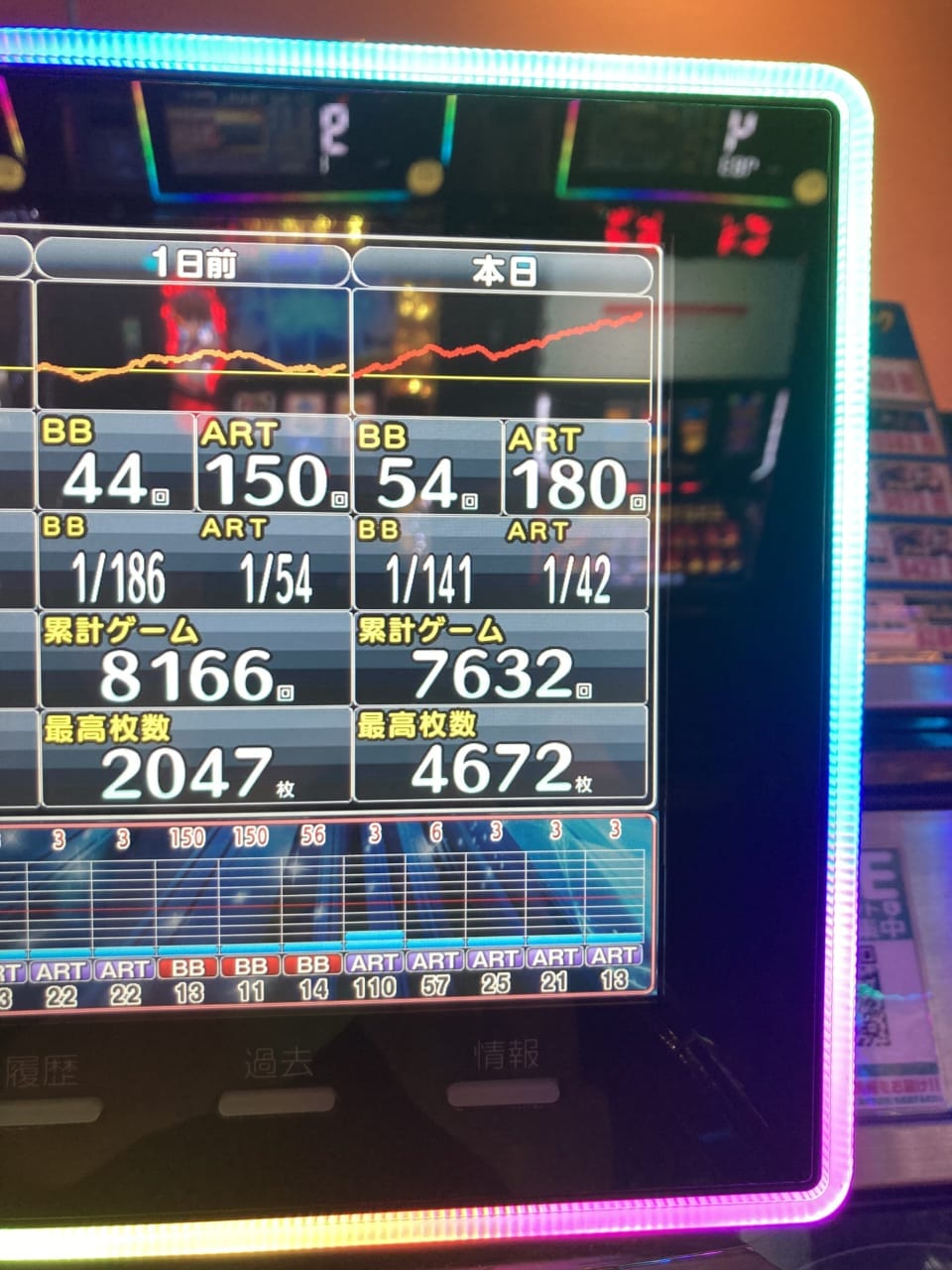 特に突出した数字もないけどART中のレギュラーが特化ボーナス4回でそこで魔石が強化されたのでロング継続。