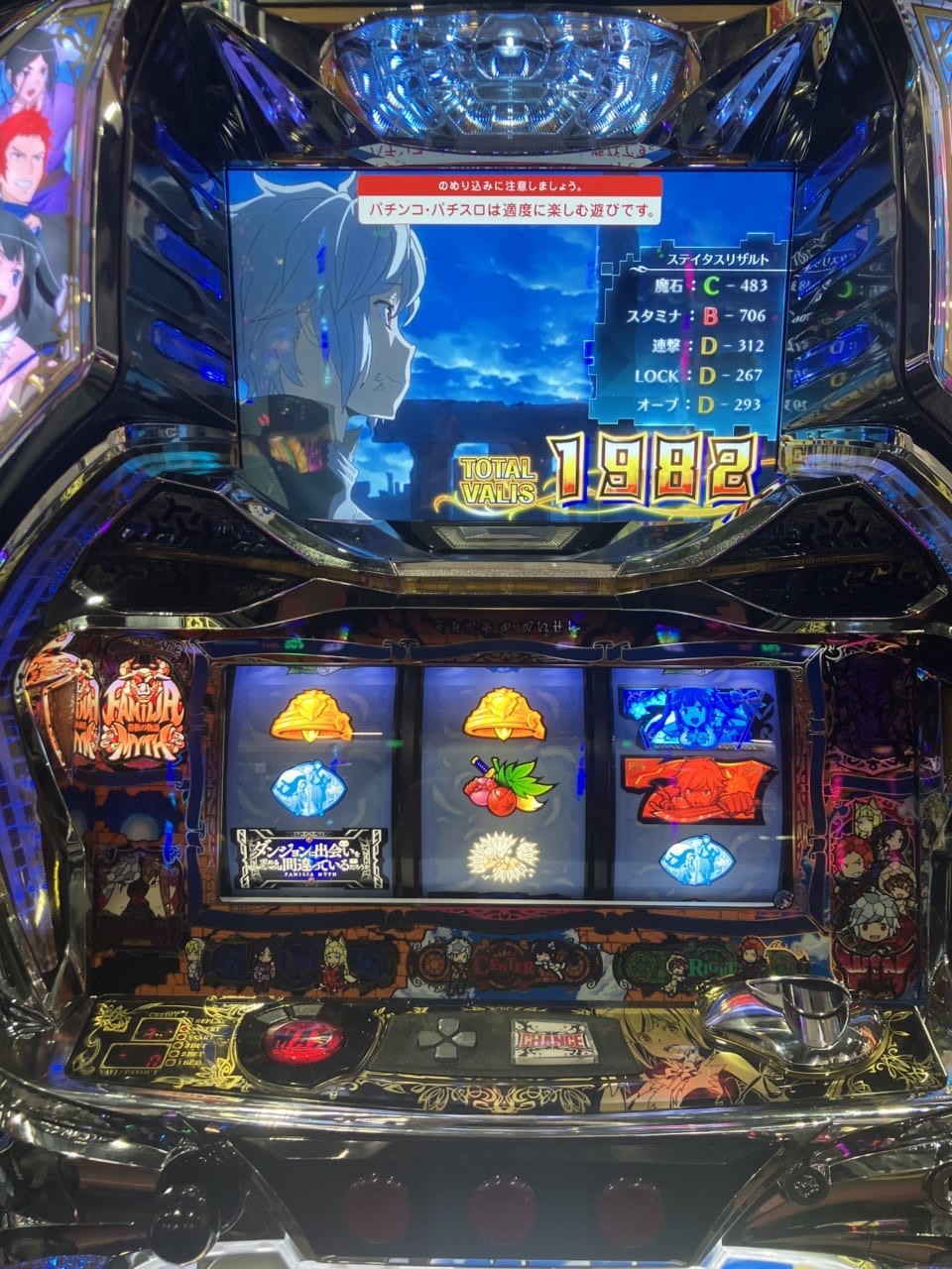 ATはスティタス? なんか分からんゴチャゴチャしたシステムをだらだら消化して ジャグラーの1reg分も出ないのを我慢出来てダンまちの演出楽しめる人向けの台です