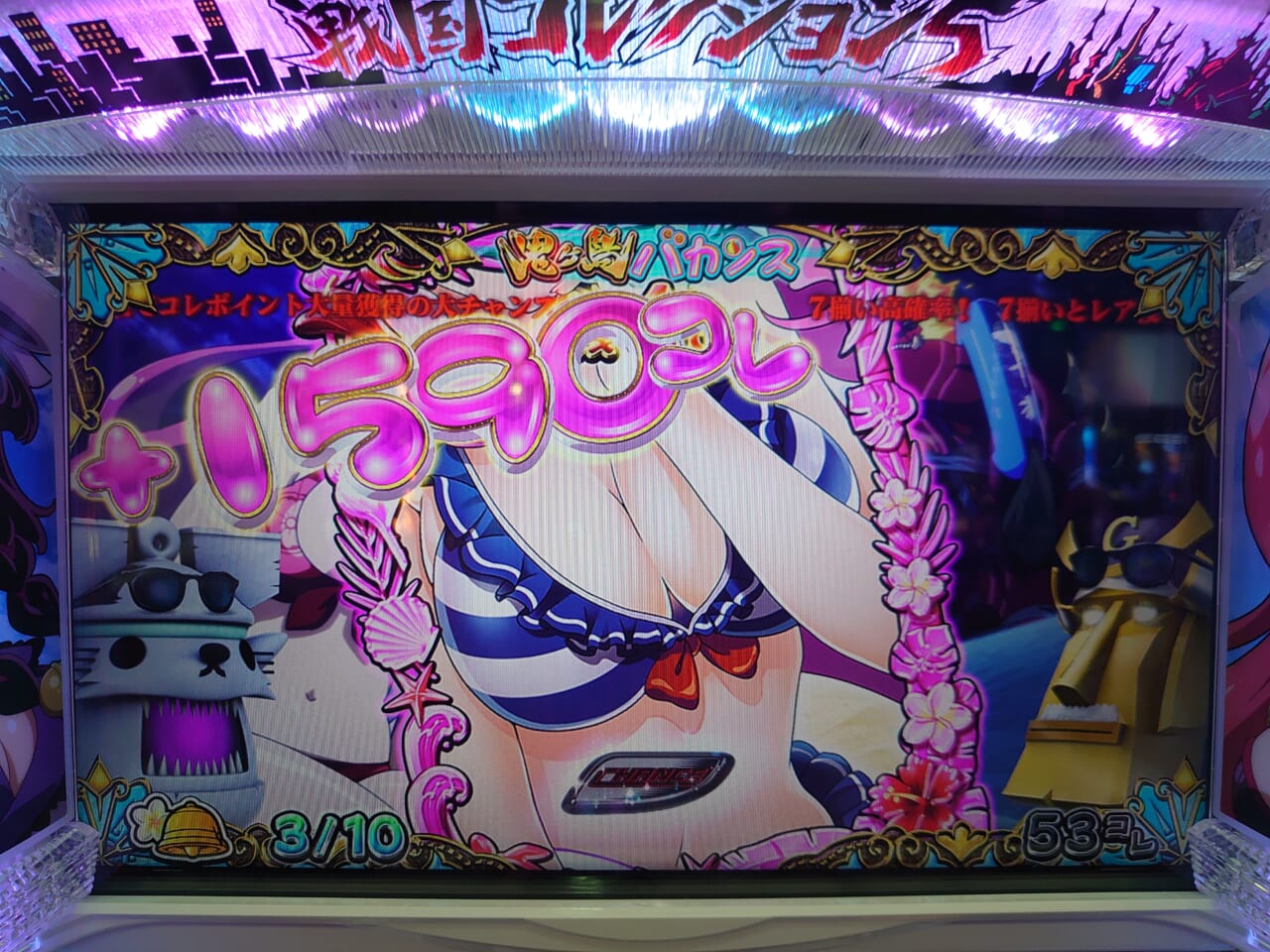 鬼ヶ島で30回以上レア役引いてるけど1回50コレ乗っただけで後全部最低保証の30コレ、強チャンス目と強チェリーも最低保証の100と300のみ