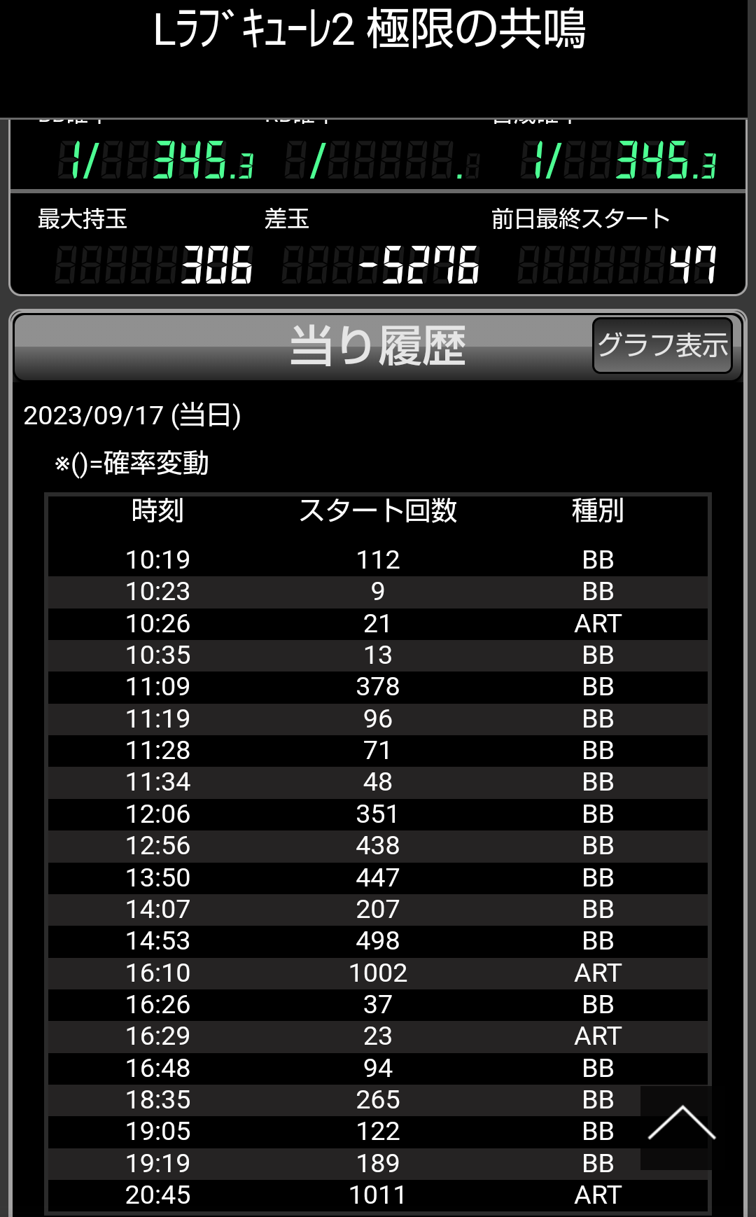 一日打ってボーナス確率1/130でも負けるのはさすがにキツイねA+ARTってこんなのだっけ?