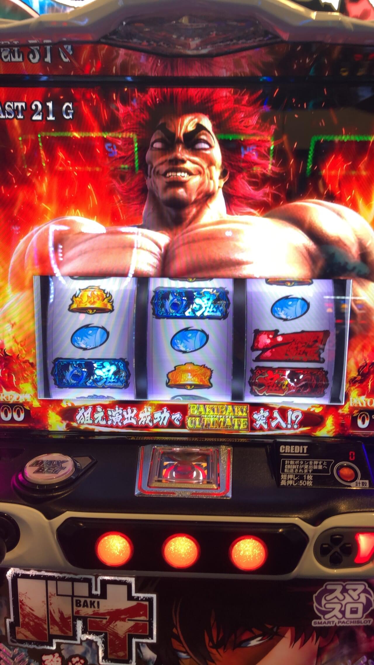 バキは80%取っても伸びないからAT入れる(ここまでは楽)→Vストック乗せまくる(超高確で高ゲーム数スタートで男雄漢比べ高レベル引く)→強喰引く→強喰で択当て決める→上位ATで再度強喰引く→ループ