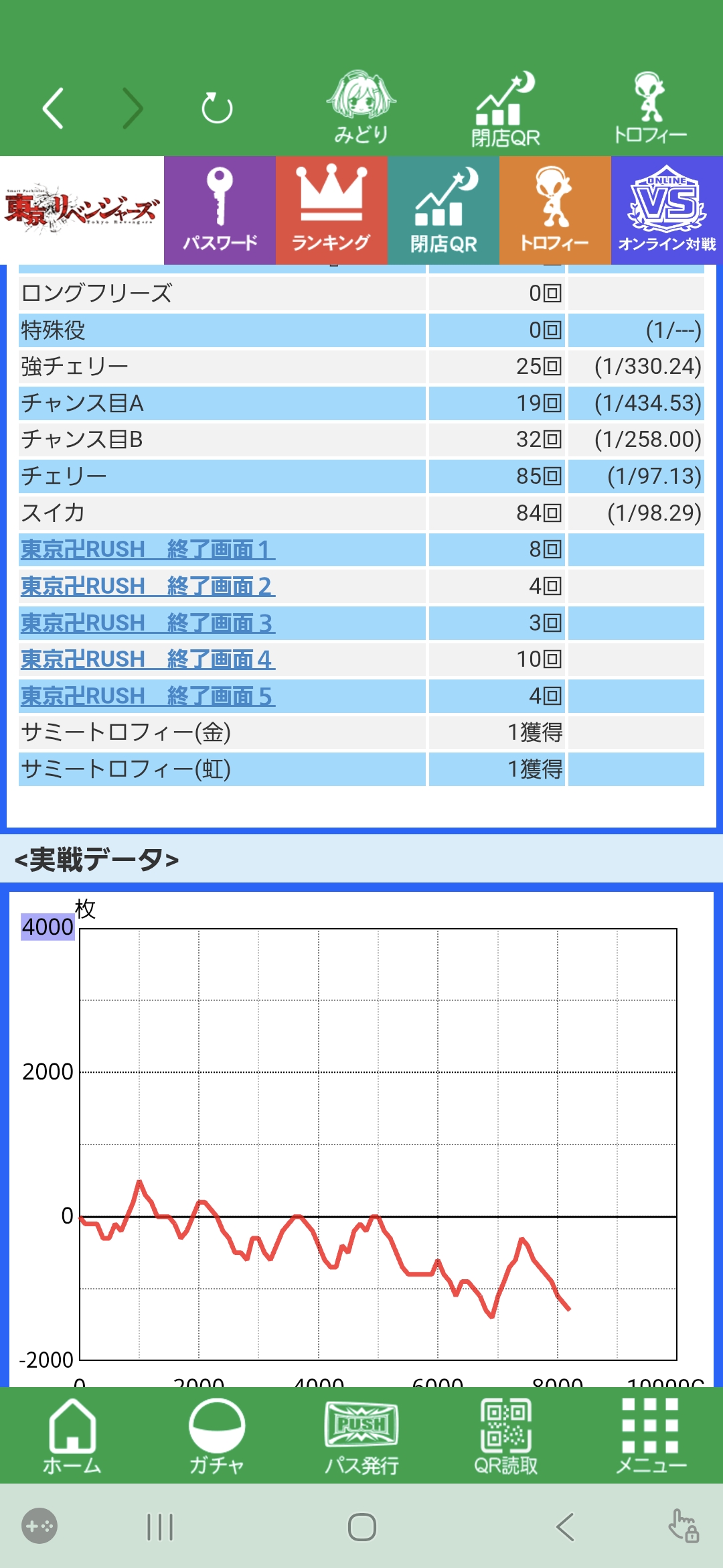 モードは8割方Aで2割B。1回だけチャンスであたったかも。天国は無し。示唆含め途中までBっぽい動きしときながら突然500ハマってAでしたのパターンがめちゃくちゃ多かった。示唆は武道赤で1スルー後当選以外は全てガセった。