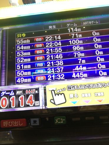 BIGは30ゲーム(2ベット12枚払い出し、360枚払い出しで終了)なので、合計1260ゲーム回しましたが、1/600の外れが一度も来なかったので低設定と判断しました!