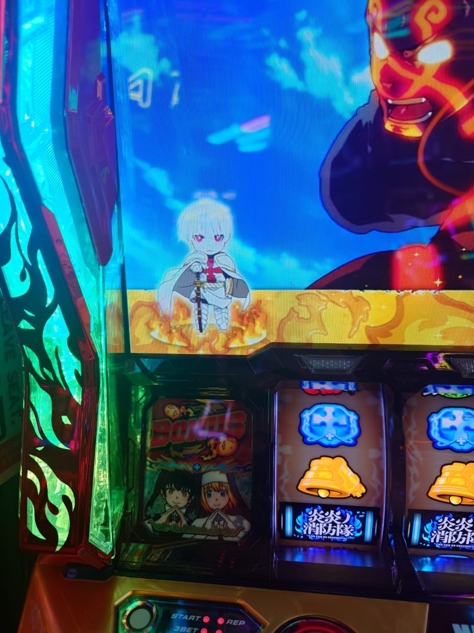 炎炎ループ(炎炎激闘や炎炎大戦など)間2000G消化でSPエピソードボーナス(炎炎激闘濃厚)に当選。設定変更時は最大1500G+αに短縮。
