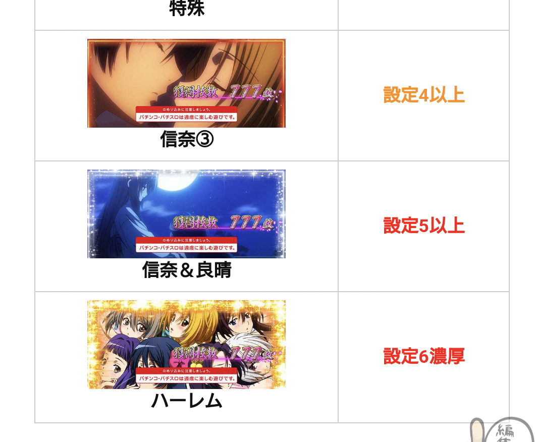 ・通常時、CZ、AT全てが設定4以下とそれ以上で天と地程の差が生まれている。特に、6は優遇され過ぎ。台の触れ込みである「当たりが軽く、マイルド」の部分は4以上の事を指している。後、皆言っているけどコイン持ちが公表値より悪すぎて、平均32は回らない。