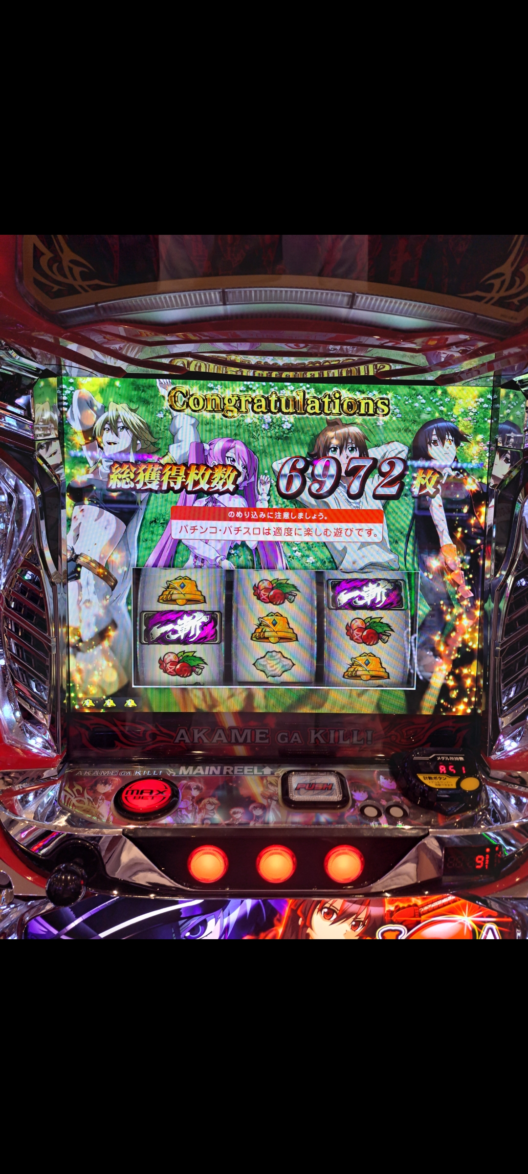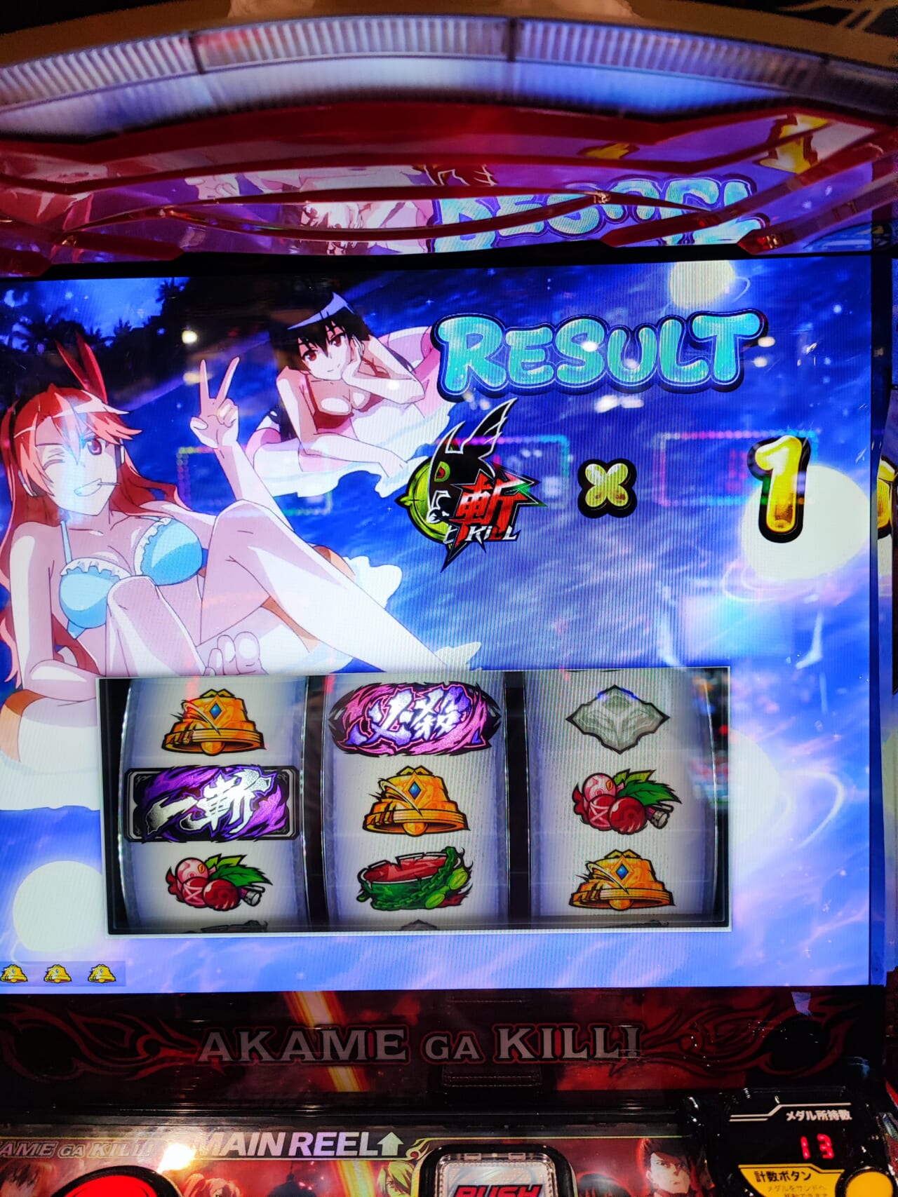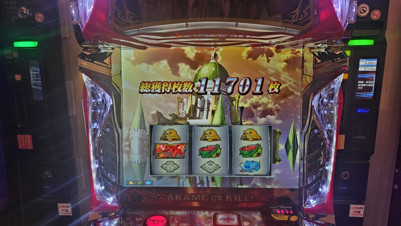 最初のATで1セット目にレア役連打して斬ポイント10P溜めてイェーガーバトル→勝利→バカンス作戦とうまく進んだ時はやれるかと思った。期待値1160枚あるならそこそこ出るだろうと思った。
