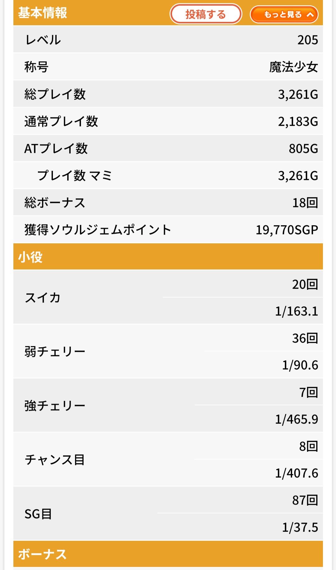 BIG、AT後のワルプルギスの夜敗北後にヤメ。様子を見る場合は100Gの前兆確認ヤメが1つの目安。プチボーナス後は天井までのゲーム数を引き継ぐ。