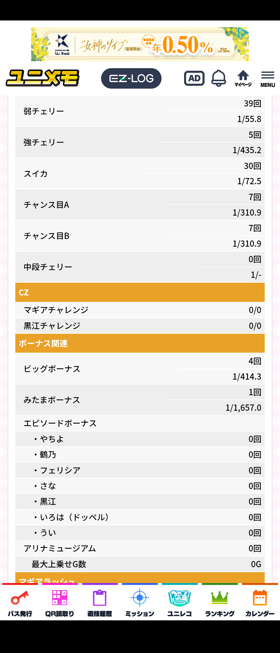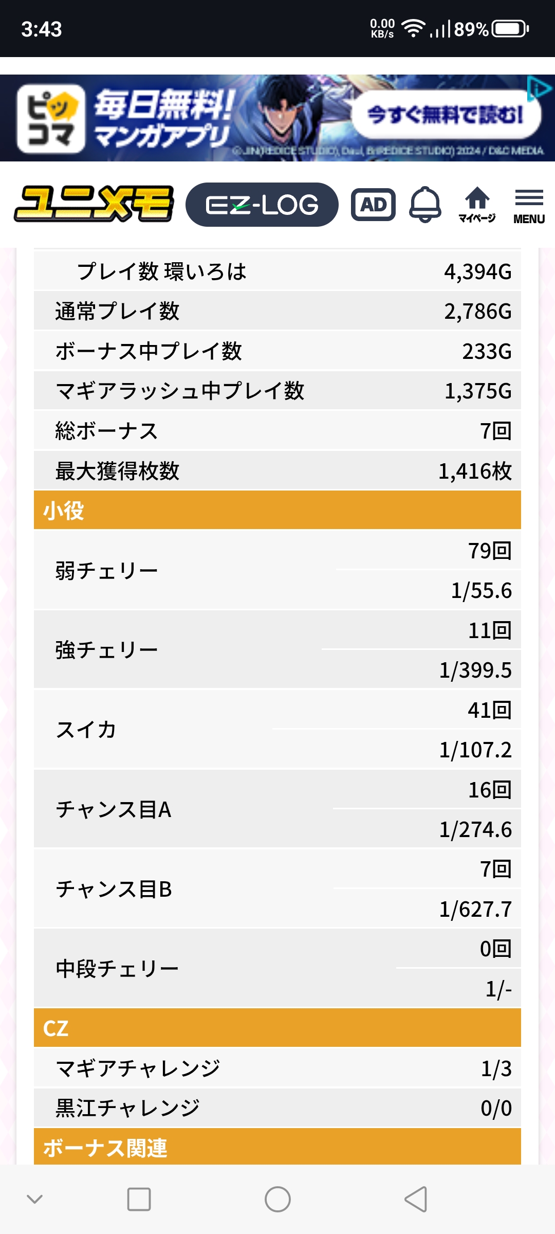ユニメモでは判別できませんがCZがスイカで連続当選したりポイント倍の獲得は魔法少女モードの可能性があるので別でカウントしたりしてもいいですよ。