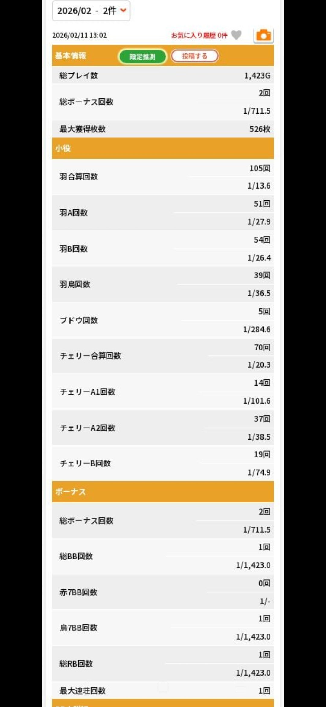 小役の出現率についてはチェリーAの引き強分はプラス33枚、羽の引き強分はプラス59枚、ブドウの引き弱分はマイナス34枚、3枚役の引き弱分はマイナス35枚が本来の確率と比べてのブレとして現れているが、これは誤差の範囲ということで無視して良いかも。