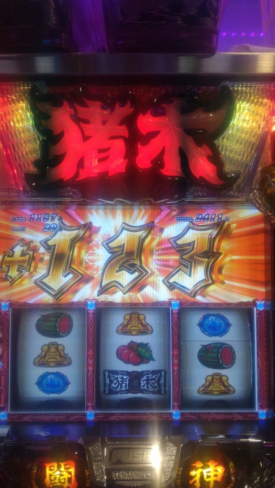 5ゲーム間上乗せのやつが選択され次ゲームから上乗せって所で強チャンス目を引き5ゲーム間チェリー4回中チェ1回で全て123上乗せになり615スタートあとはボナ2回引いてボナ中は1回ずつイノキ揃いで50ゲーム上乗せ、その他ちょろちょろ上乗せで総ゲーム数が1000ゲーム程で3000枚弱でした。多分設定良くなかったと思うので上乗せ中にレア役ラッシュ?にならないと勝てないなと思いました。