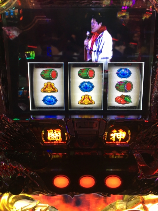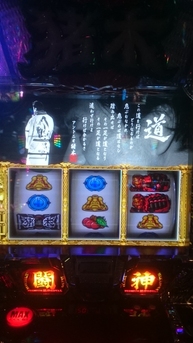追加投資8kでフリーズ。ボーナス中猪木揃い3個でこれからと期待するも、すべてアントンイズム。もちろんレア役引けずに50ゲーム開始がデフォ。アントンイズム中、一度レア役なしで123ゲーム載せるも途中のartは強チェリーで10ゲームを2回のせのみと見せ場(T_T)無く計320ゲームで終了。